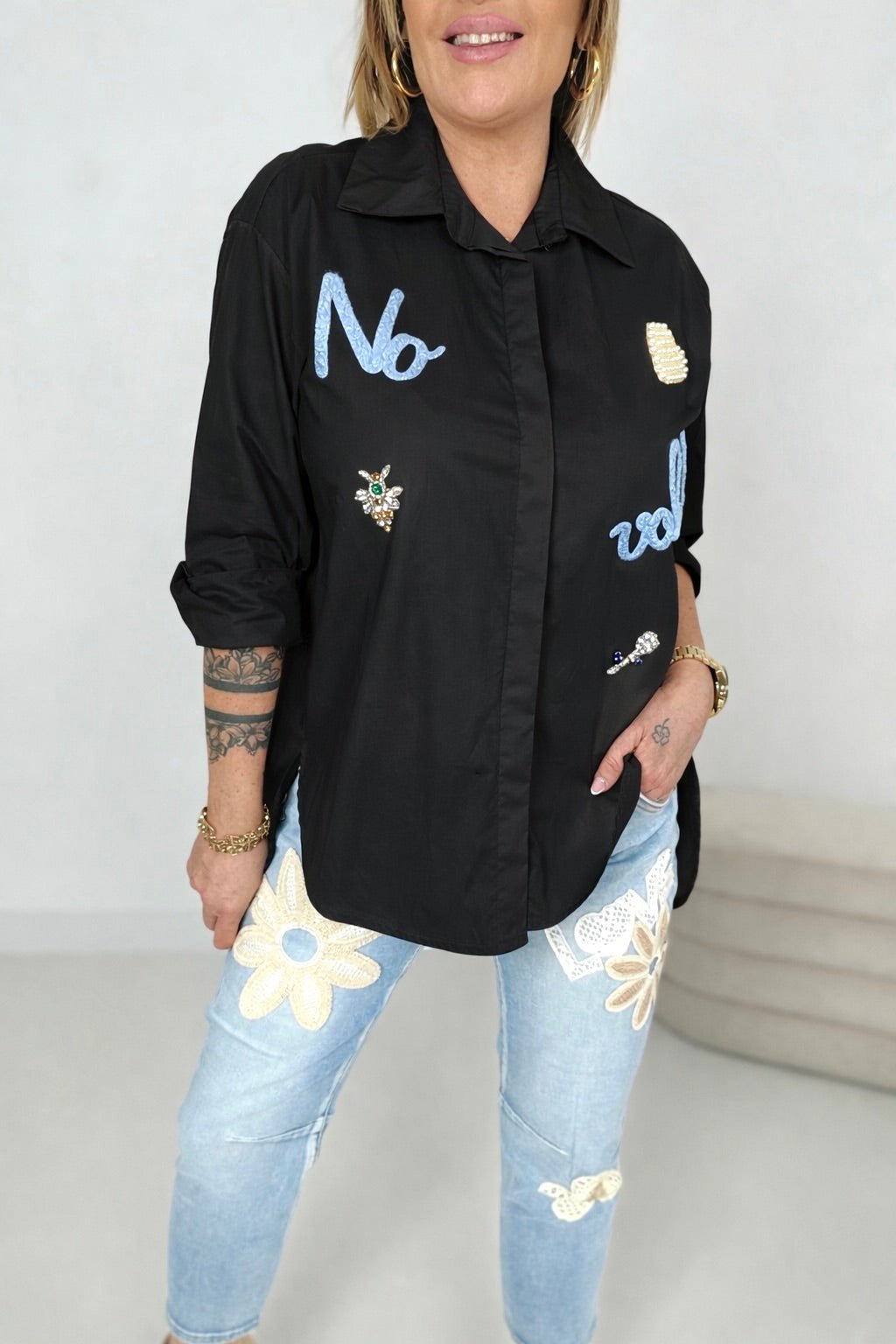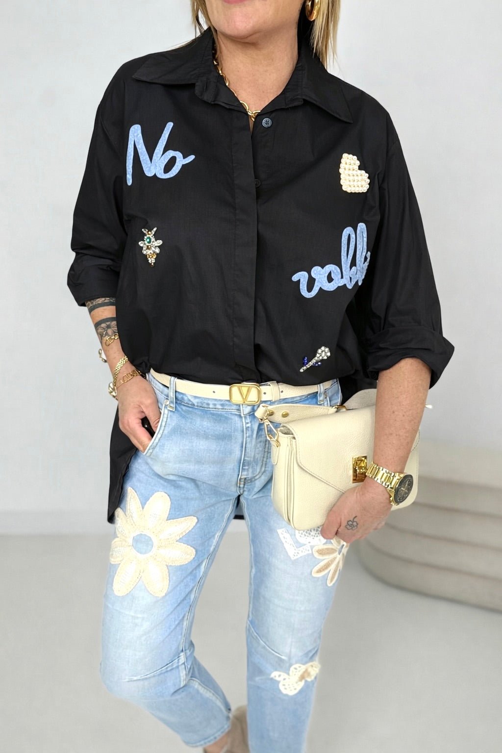 Vorne dekoriert mit Strasssteinen, Perlen & Print